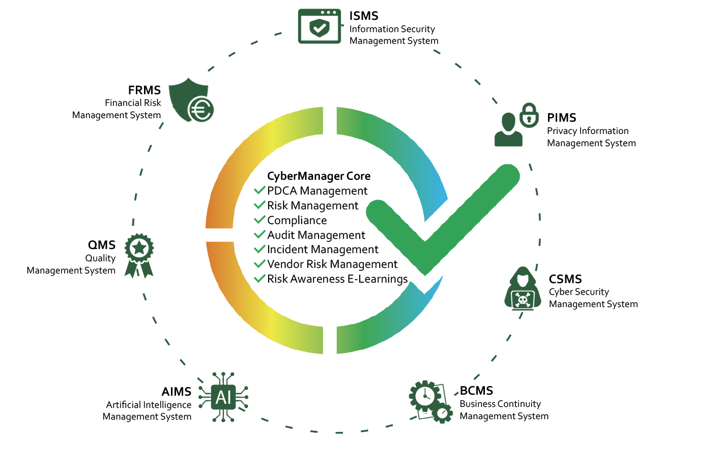 Onze managementsystemen zijn speciaal ontwikkeld om toe te voegen aan het geïntegreerde IRM360 CyberManager Core Platform. Dit platform is beschikbaar in verschillende arianten (Foundation, Advanced en Pro).De Advanced en de Pro worden breed toegepast binnen publieke organisaties. Zo biedt de Advanced functionaliteit voor Single Sign On Integratie, ENSIA rapportages etc. De Pro gaat een stapje verder en biedt een geïntegreerd GRC-overzicht op basis van het Three Lines Model en beschikt over aanvullende registers: